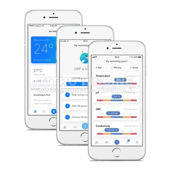 Blue Connect analizza la tua acqua 24 ore su 24, 7 giorni su 7 e ti comunica il prodotto giusto per la cura della tua piscina.