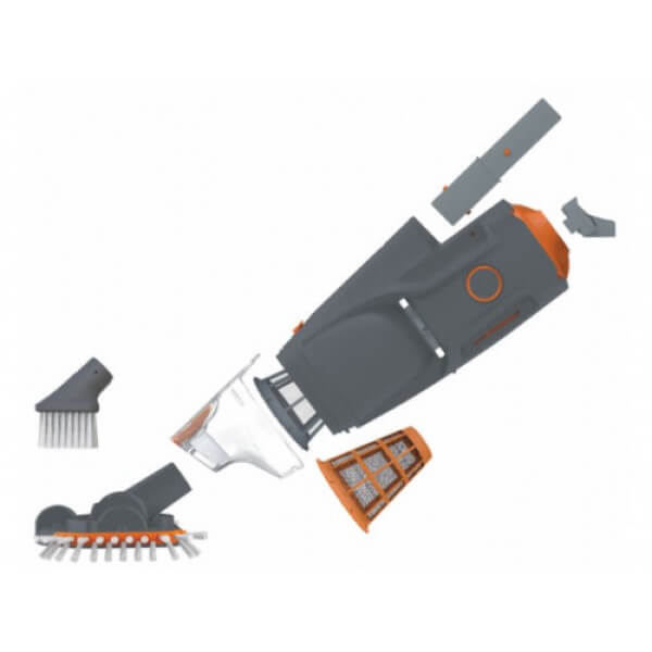 Il set comprende: aspiratore a batteria, caricabatteria, filtro in acciaio inox, filtro fine in acciaio inox, spazzola aspirante flessibile, spazzola piatta