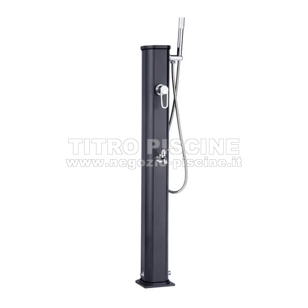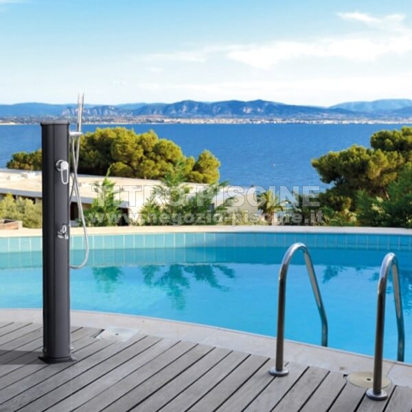 Doccia solare JOLLY GO compatta e sofisticata con lavapiedi. Il serbatoio dell'acqua 100% ecologico Jolly Go 20L è riscaldato dal sole. La doccia solare e' realizata in alluminio. La doccia Jolly Go può essere facilmente collegata a qualsiasi tubo dell'acqua.