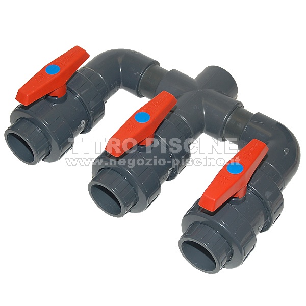 Collettore di aspirazione per il collegamento degli impianti nella sala macchine con tre valvole: per l'aspirazione, per lo skimmer e per il fondo della piscina.