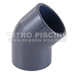 Gomito standard in PVC di 45 gradi con presa per l'incollaggio interno da entrambe le parti.