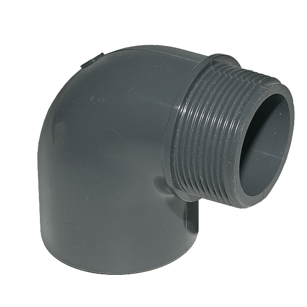 Gomito in PVC di 90°, PN 16, con filettatura esterna da una parte, dall’altra ha l’attacco standard a incollaggio.