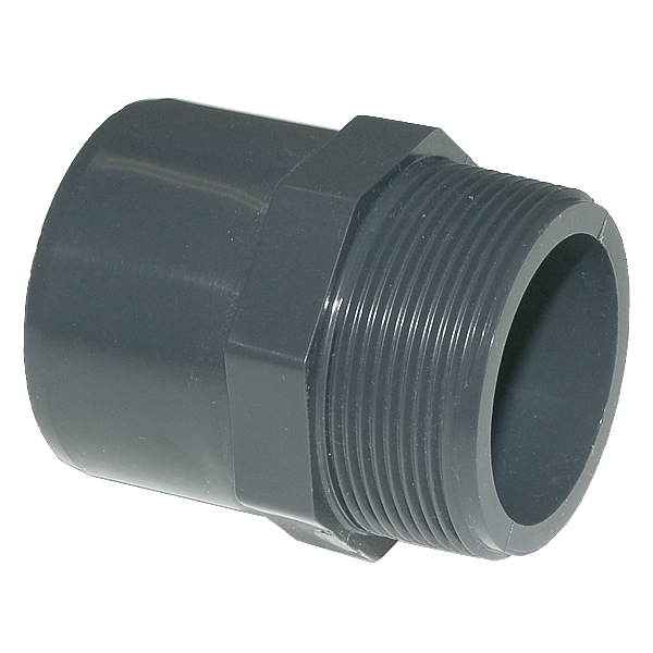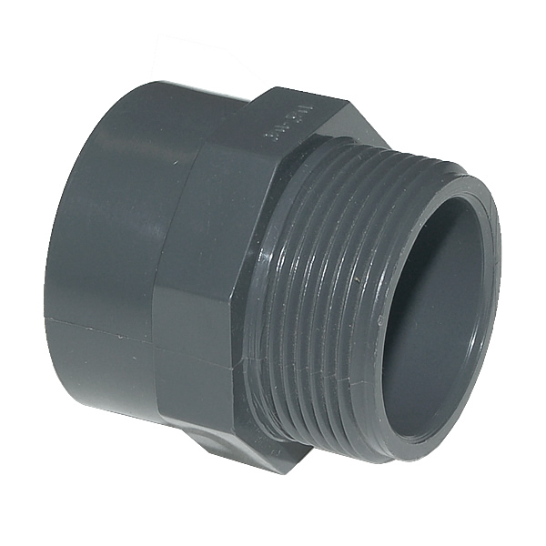 Riduttore in PVC con attacco a incollaggio interno ed esterno da una parte e dall’altra filettatura withworth esterna.