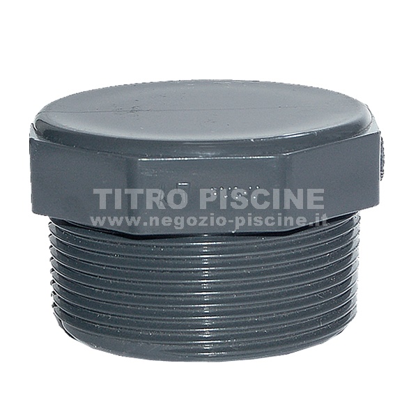 Tappo standard in PVC con filettatura esterna. Da utilizzare nei casi in cui vogliamo temporaneamente o definitivamente chiudere le aperture con filettatura interna (raccordi con filettatura esterna, ritorni dell'acqua, scarichi di fondo etc.).