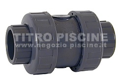 Valvola di non ritorno in PVC con attacchi per incollaggio interno su entrambe le parti. Permette una sola direzione del flusso. Viene utilizzato nei casi in cui non vogliamo un flusso veloce nella direzione opposta a quella desiderata. Utilizzato soprattutto per proteggere la pompa di circolazione della piscina (diminuisce la probabilità di danni alla turbina della pompa). Funziona a molla.
