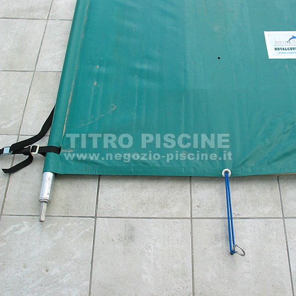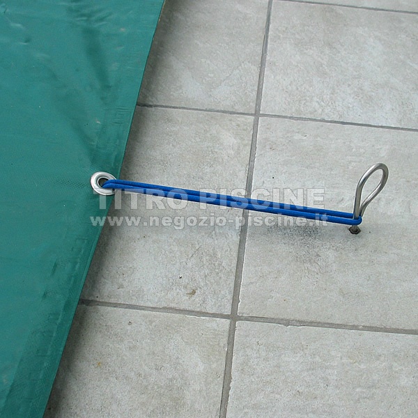 Ad una distanza adatta dalla copertura forate il suolo intorno alla piscina e inserite nel foro il picchetto in inox per agganciare l'elastico, il laccio etc. Dopo aver smontato la copertura potete semplicemente togliere il picchetto da terra e conservarlo insieme agli elastici e alla copertura.