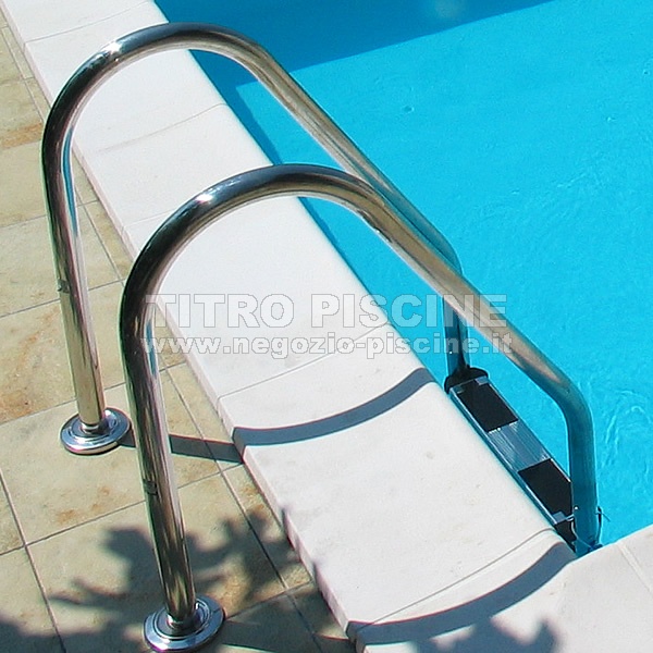 Scaletta per piscina Inox di larghezza standard per l'entrata e l'uscita dall'acqua realizzata con tubo del diametro di 43 mm e gradini in inox, qualità AISI 316.