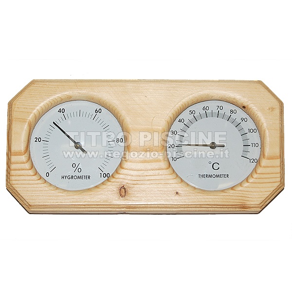 Cornice realizzata per le saune finlandesi in legno (o combinate) con igrometro e termometro con lancette. Fissaggio semplice sulla parete in legno della sauna.