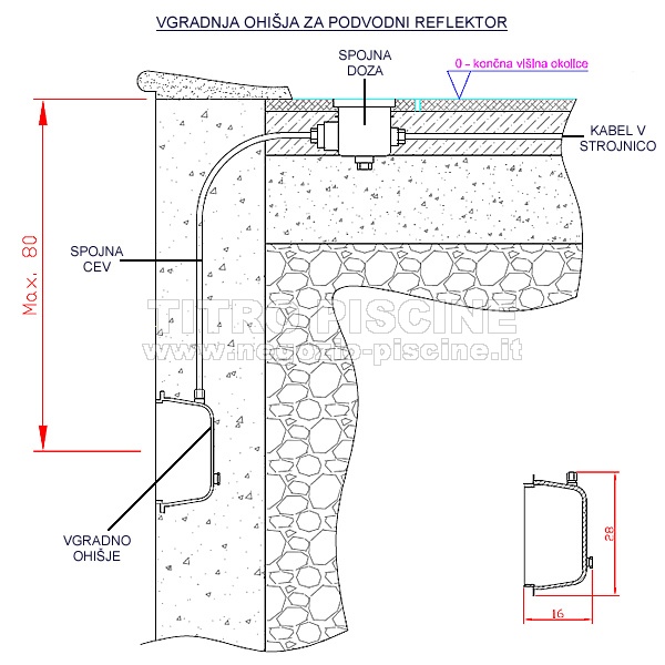 Corpo standard per faro subacqueo in ABS, da installare nelle pareti in muratura della piscina, con anello rinforzato in bronzo per piscine IN CEMENTO.